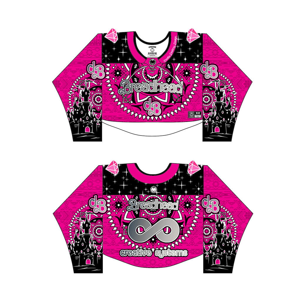 The Barbie Dreamscape Cropped Hockey Jersey, a vibrant fusion of playful femininity and bold tribal edge. This piece features Barbie-themed mandalas placed at key focal points, designed to catch eyes from every angle - whether you’re on the move, on the dancefloor, or owning the moment.